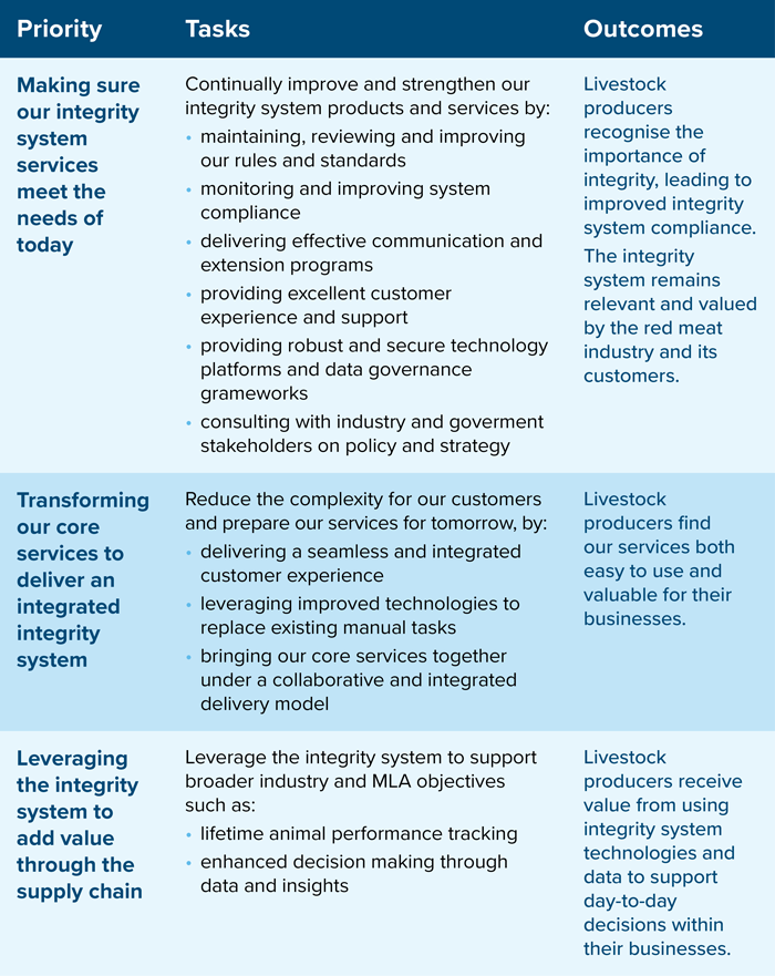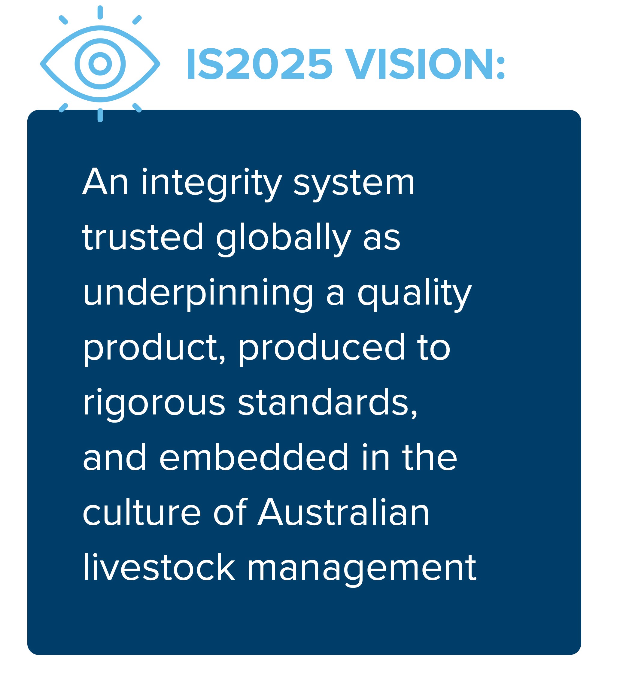 An integrity system trusted globally as underpinning a quality product, produced to rigorous standards, and embedded in the culture of Australian livestock management.